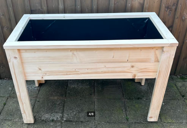 Moestuinbak gemaakt van onbehandeld , gedroogd en geschaafd steigerhout. De binnenkant is afgewerkt met landbouwplastic