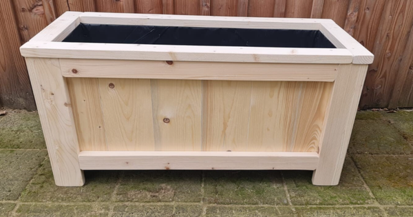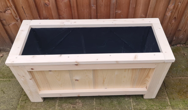 Deze bloembak is gemaakt van onbehandeld, gedroogd en geschaafd steigerhout. Deze is afgewerkt aan de binnenkant met landbouwplastic.