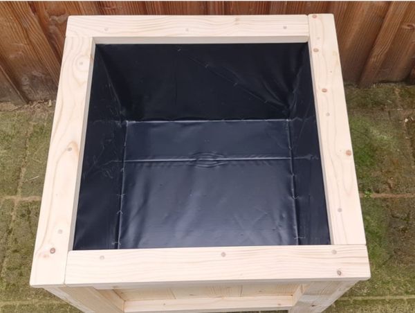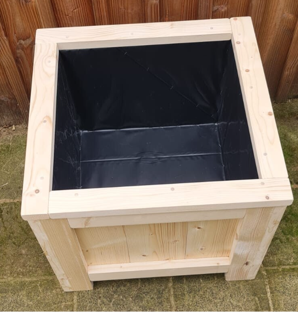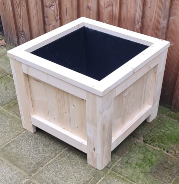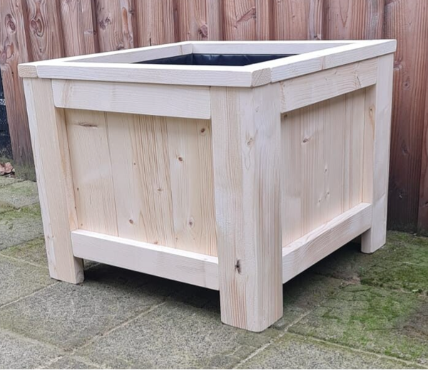 Deze bloembak is gemaakt van onbehandeld, gedroogd en geschaafd steigerhout. Deze is afgewerkt aan de binnenkant met landbouwplastic.